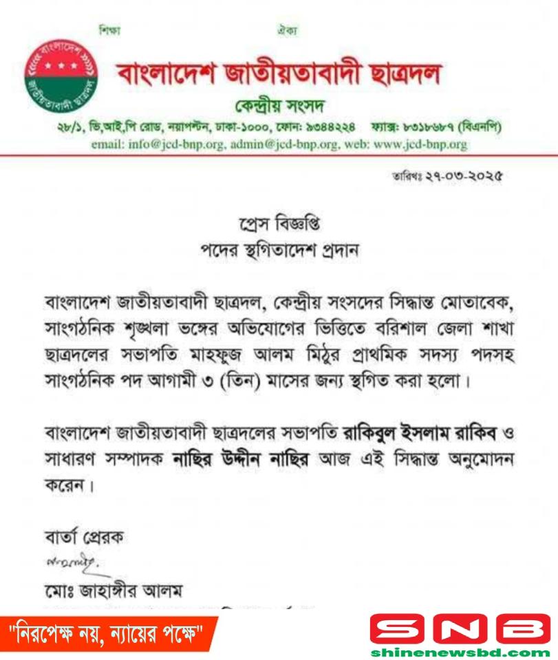 এছাড়াও ছাত্রদলের দপ্তর সম্পাদক মো. জাহাঙ্গীর আলম স্বাক্ষরিত চিঠিতে জেলা ছাত্রদলের সভাপতি মাহফুজ আলম মিঠু, স্বেচ্ছাসেবক দলের দপ্তর সম্পাদক আব্দুল্লাহ আল মামুন স্বাক্ষরিত চিঠিতে মহানগর স্বেচ্ছাসেবক দলের আহবায়ক মশিউর রহমান মঞ্জু ও জেলা স্বেচ্ছাসেবক দলের সদস্য সচিব কামরুল আহসানকেও আগামী তিন মাসের জন্য প্রাথমিক সদস্য পদ সহ সাংগঠনিক পদ স্থগিত করা হয়েছে।